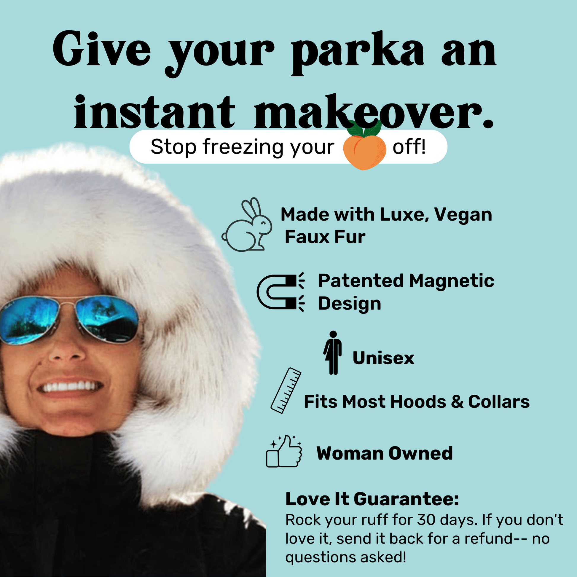 Add our faux fur ruff to any hood or collar using our patented magnetic design. Let us show you how.